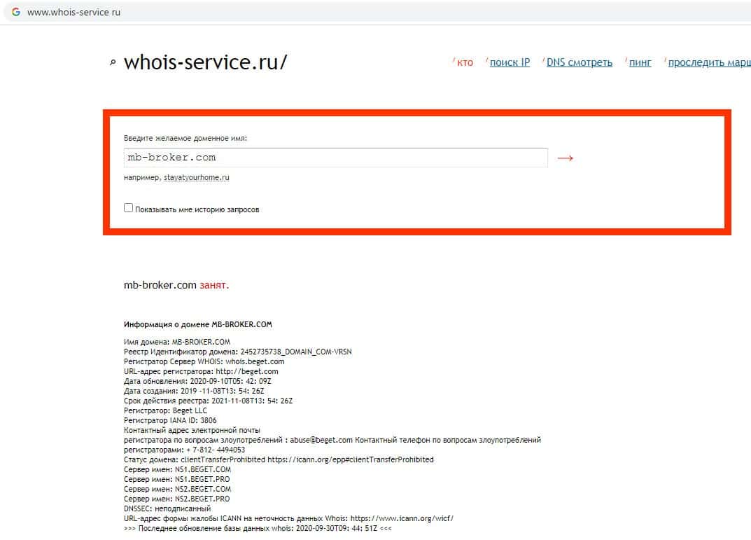 Сервис whois-service ru не может найти данные о владельце домена сайта мошеннической организации MB Broker, доверять сайту скам-конторы нельзя.