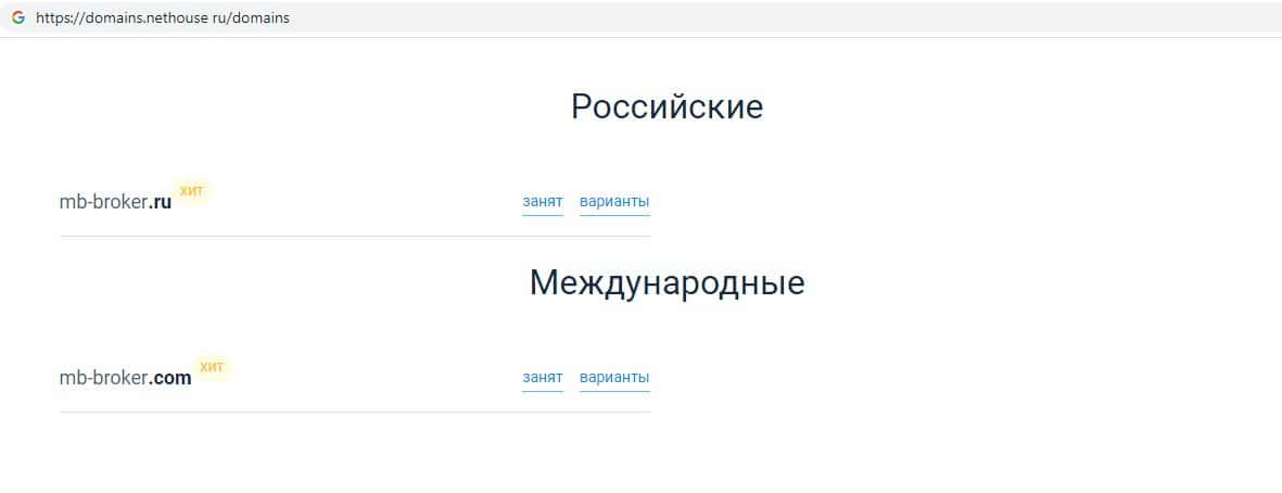 На веб-сервисе domains nethouse ru была произведена проверка домена mb-broker com, которая показала то, что данный интернет-лохотрон находится также на сайте mb-broker ru.