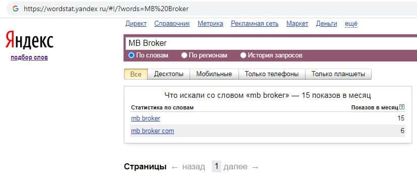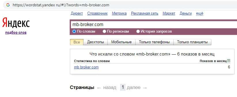 Количество запросов по бренду названия домена компании без точки "mb-broker com" на wordstat yandex ru составило также 6 показов за месяц.