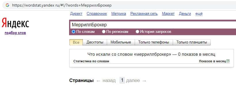 Количество запросов по бренду названия компании на русском языке без пробела "МерриллБрокер" на Вордстарт Яндекс Ру вероятно равно 0.