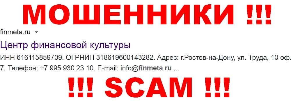 Мы уверены, что мошенники МЕТА Центр финансовой культуры жульничают в самых разных странах, в основном в отношении говорящих на русском людей, исходя из этого адреса, если вдруг Вам довелось посотрудничать с мошенниками FinMeta Ru, то в такой ситуации оставьте свой электронный ящика в форме для обратной связи далее, и тогда мы с вами обязательно установим контакт.
