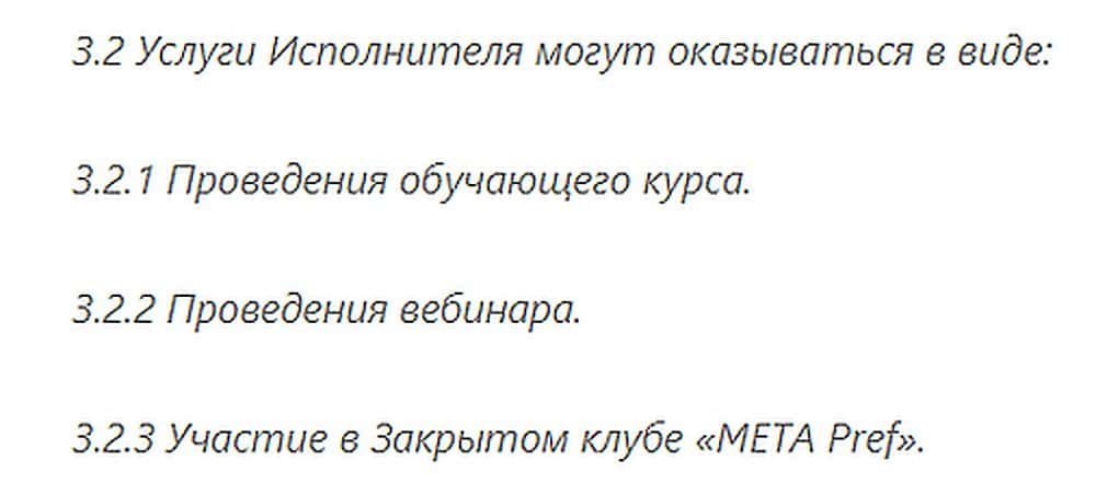 Шарлатаны FinMeta Ru обещают на сайте кучу услуг, вплоть до советов по вкладам и даже доверительного управления. Но в соглашении видно, что предоставляют они только вебинары.