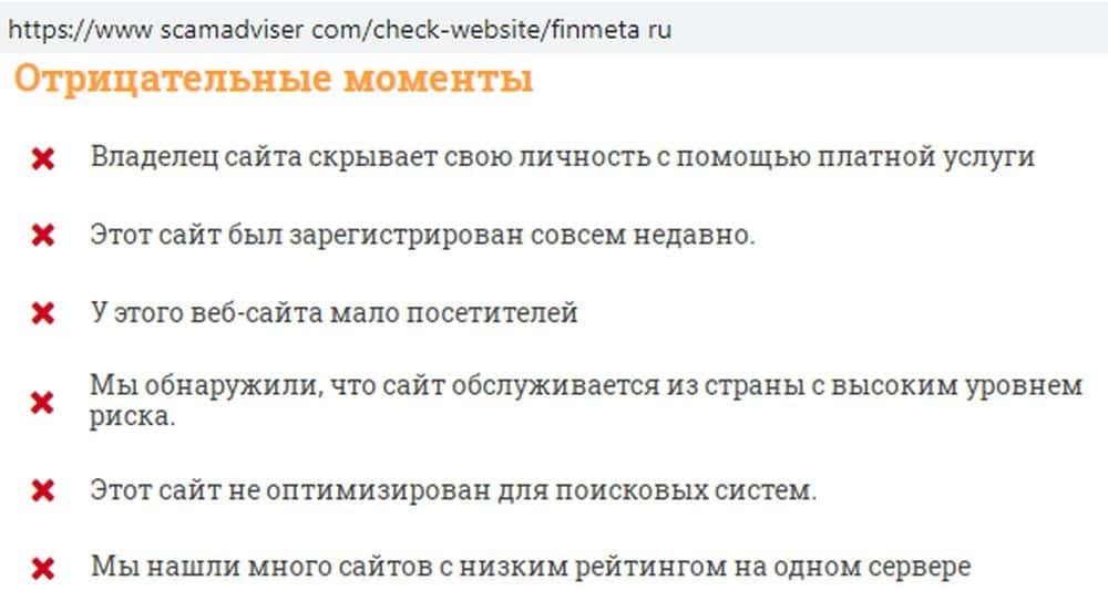 Только взгляните, сколько негативных моментов нашел сервис скамэдвайзер ком у сайта наперсточников МЕТА Центр финансовой культуры. Не стоит посещать этот мутный ресурс.