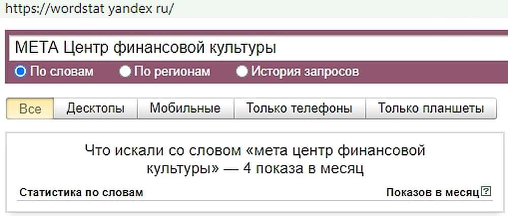 Поисковый запрос на бренд "МЕТА Центр финансовой культуры" поступал еще меньшее количество раз к серверу Яндекса. Его всего 4 раза пытались найти пользователи интернета.