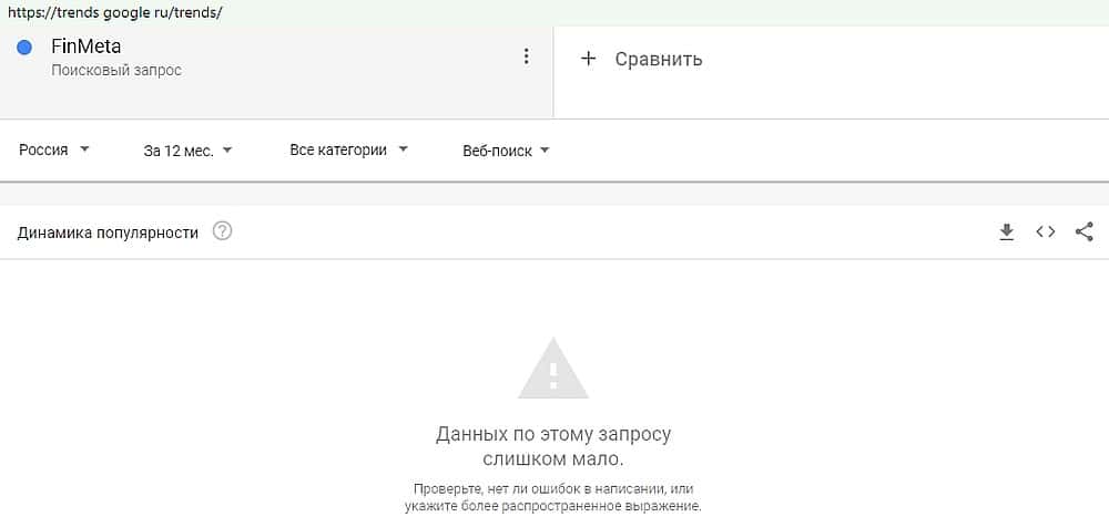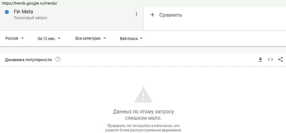 Интернет-аферюг "finmeta.ru" искать пользователи Гугл не собираются. Именно поэтому статистика сервиса Гугл Трендс оказалась нулевой, при анализе популярности этого хайпа.