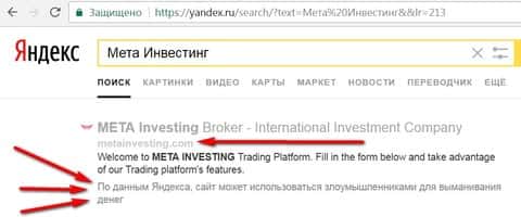 У Яндекса к сайту metainvesting com тоже, мягко говоря, не однозначное. По данным Яндекса официальный сайт Мета Инвестинг выманивает у людей деньги, и переход на сайт мошенников Мета Инвестинг Ком не возможен.