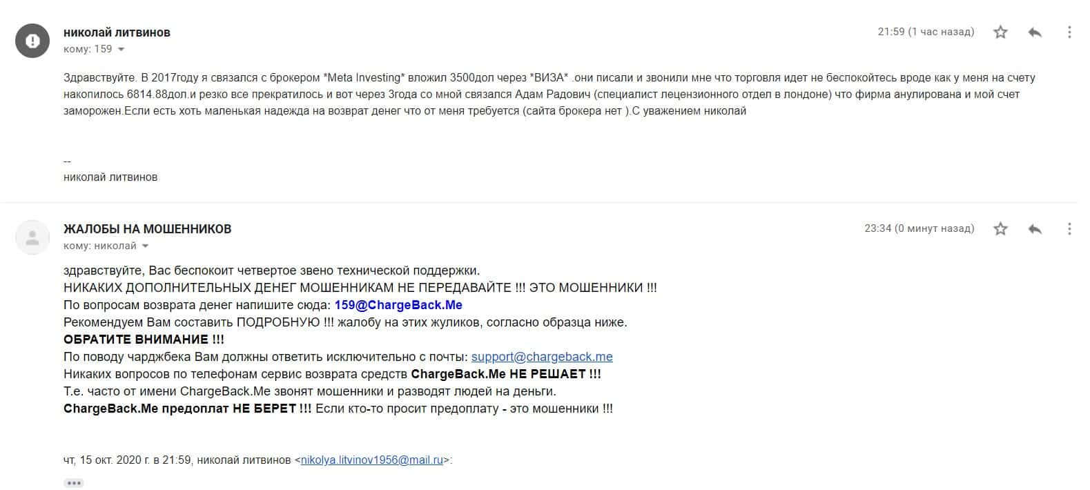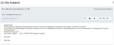 Обнаглевший брокер Meta Investing не желает отвечать на письма своему клиенту. Он работает с данной конторой уже более 2-ух лет и после успешной своей деятельности решил снять часть прибыли. Но на запрос о выводе денег его попросили связаться со своим брокером. Он попытался это сделать, а в ответ тишина, как и обычно бывает. Теперь 2 года упорного труда коту под хвост.