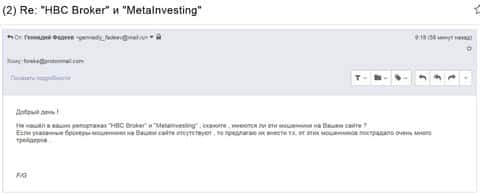 Мошенники из HBC Broker, работая в паре с Мета инвестинг, обманывают людей налево и направо. Прикрываясь своей деятельности они действуют сообща и ловко разводят жертв, которые пытаются честно заработать на рынке Форекс. Берегитесь мошенников.