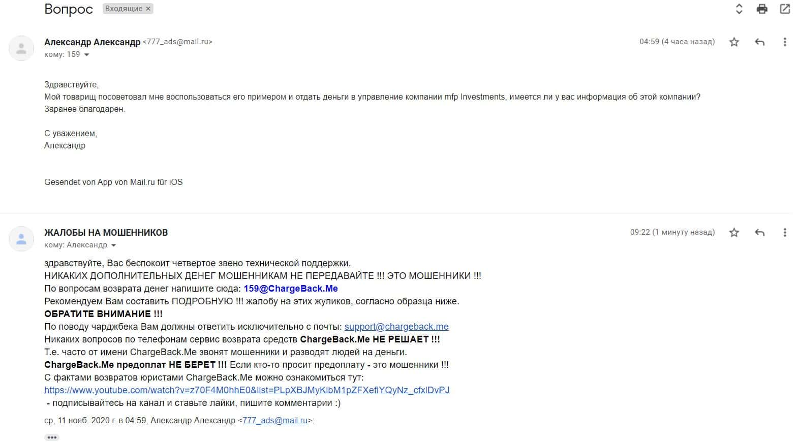Что касается перспектив вернуть вложенные деньги от АФЕРИСТОВ МФП Инвестментс - пишите письмо сюда: [email protected]