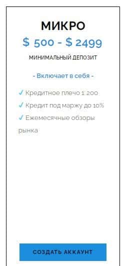 Первый тип счета от жуликов МФП Инвестментс - это "Микро". Он включает в себя: сумма минимального депо 500-2499$, кредитное плечо 1:200, кредит под маржу до 10%.
