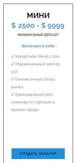 Еще один тип счета аферистов - это "Мини". Он включает в себя: сумма минимального депо 2500-9999$, кредитное плечо 1:200, кредитная маржа до 25% + обучение на веб-семинарах.
