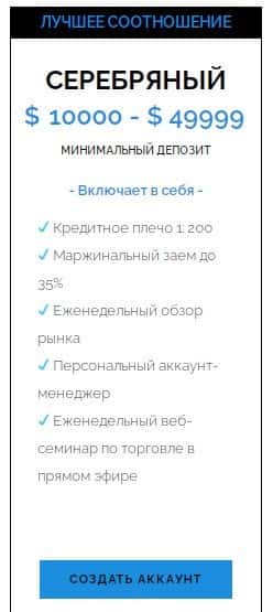 Третий тип счета жуликов МФП Инвестментс - это "Серебряный". Условия работы такие: сумма депозита 10 000-49 999$, персональный аккаунт-менеджер, кредитная маржа до 35%.