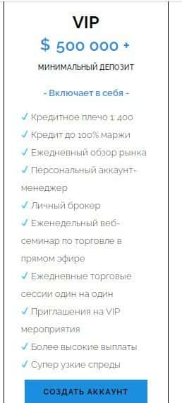"VIP счет" - это разводняк по крупному! Сумма минимального депо составляет от 500 000$. За это жулики вам: кредитное плечо 1:400, кредитная маржа до 100% и супер узкие спреды!