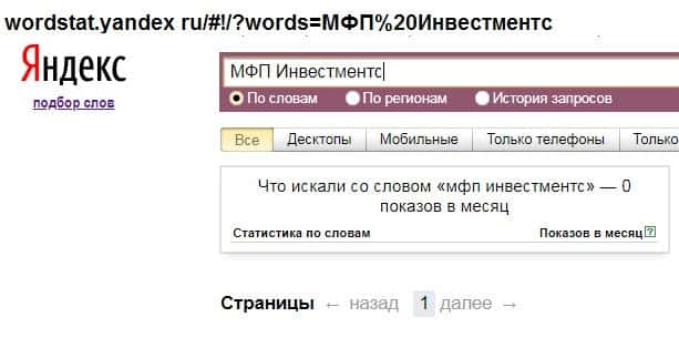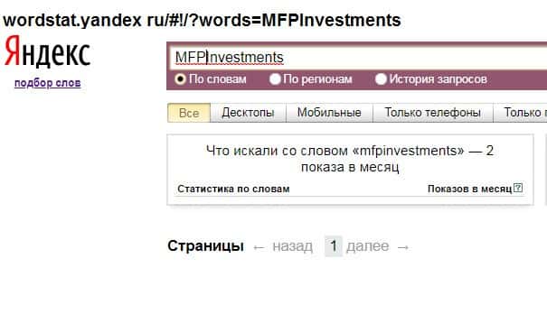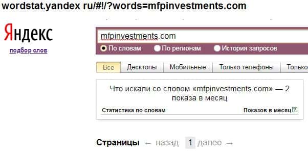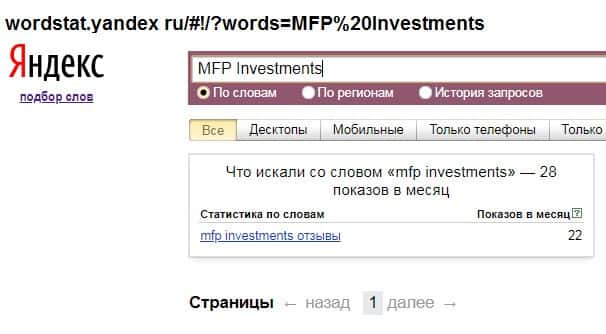 Рассмотрим насколько контент помойки МФП Инвестментс популярен среди пользователей Яндекса. По запросу "mfpinvestments.com" поиск выдает результат - 2 показа в месяц!