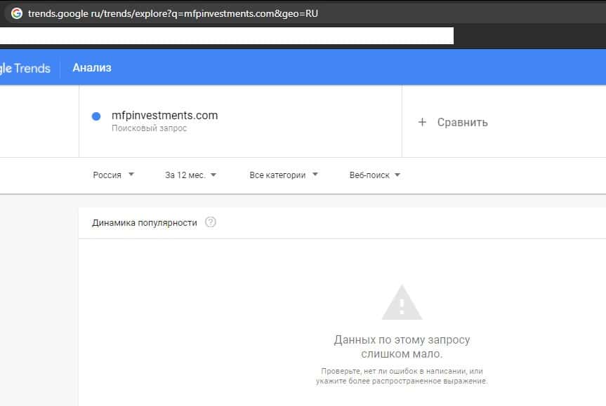 Для начала в поиске Google рассмотри запрос - название домена "mfpinvestments.com". В результате, система поиска не отображает количество показов, так как слишком мало данных!