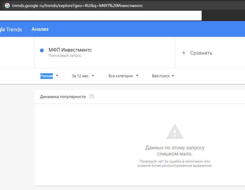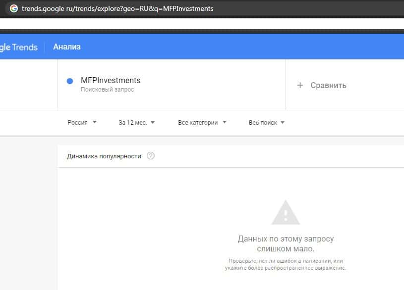 Второй запрос для статистики популярности контента, возьмем название бренда на английском языке, без пробела "MFPInvestments". Результат такой же - данных слишком мало!
