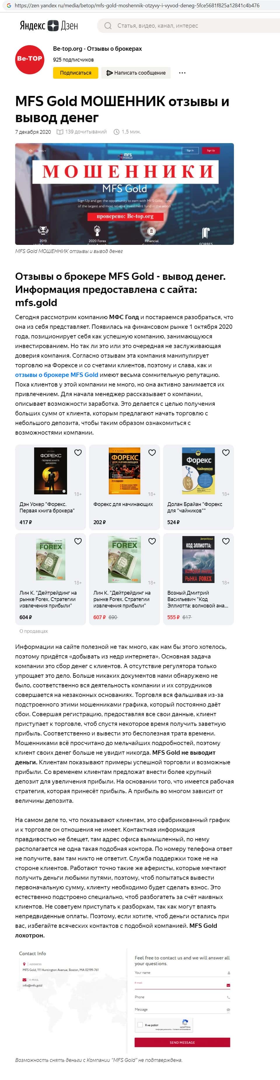 Интернет ресурс zen yandex ru опубликовал статью о фирме MFS Gold. В данной статье сайт указал, что данная контора является лохотроном, который разводит своих клиентов.