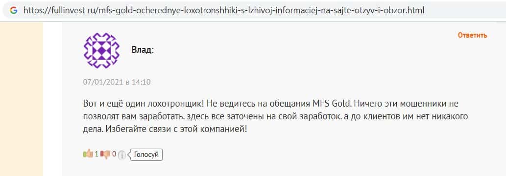 Так же интернет ресурс fullinvest ru назвал компанию MFS Gold мошеннической помойкой, так как эта организация отнимает денежные средства у наивных интернет пользователей.