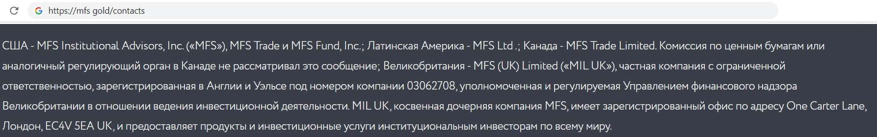 - Юридическое лицо компании финансовых кидал MFS Gold