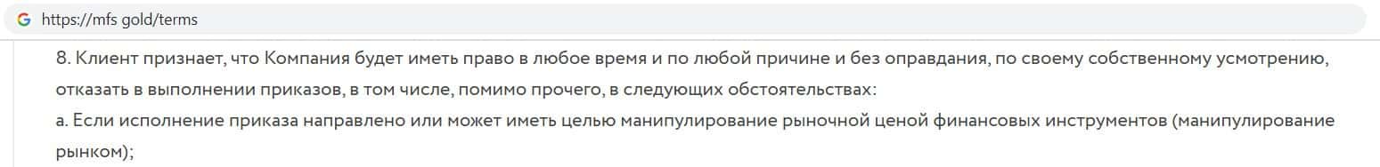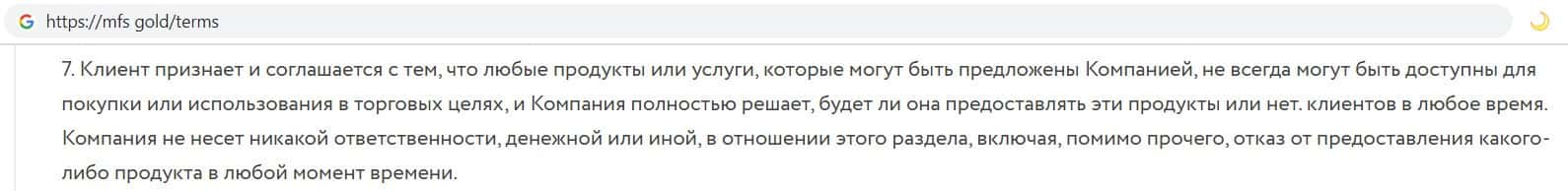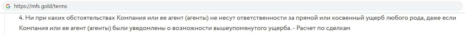 В своём клиентском соглашении, компания разводил MFS Gold указала, что не несёт никакой финансовой ответственности за какие либо операции своих клиентов.