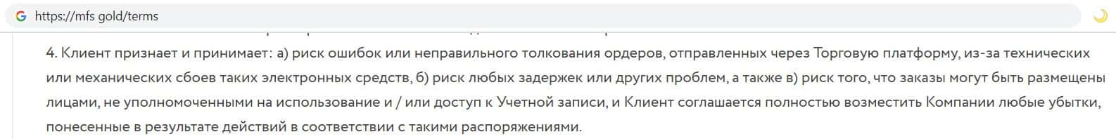 В своём соглашении компания аферистов MFS Gold так же заставляет клиентов согласится с тем, что фирма может неправильно толковать ордера, и принять риски сбоев платформы.