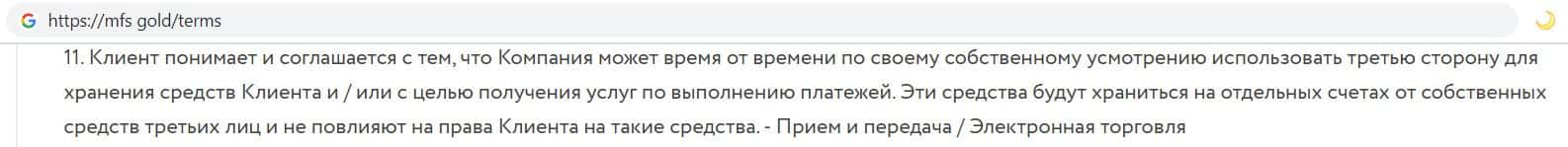 Фирма жуликов MFS Gold указала, что иногда использует третью сторону для хранения денежных средств клиентов, то есть компания передаёт кому то деньги своих клиентов.
