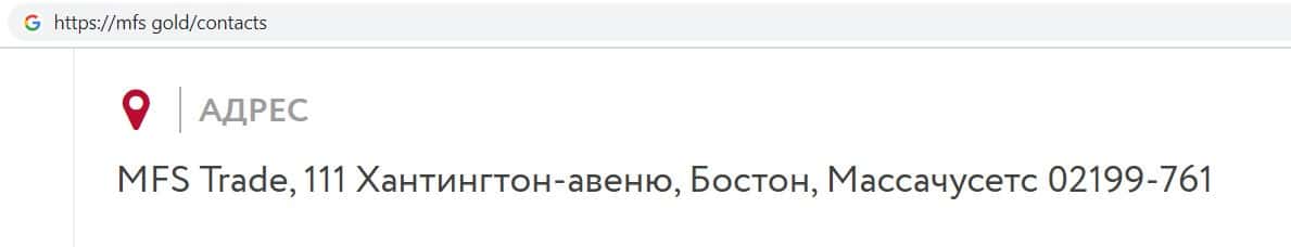 Так же контора МФС Голд указала адрес своего офиса, но это фальшивая информация, так как жулики не имеют никакого офиса, а всего лишь лгут клиентам. Фальшивый адрес кидал: