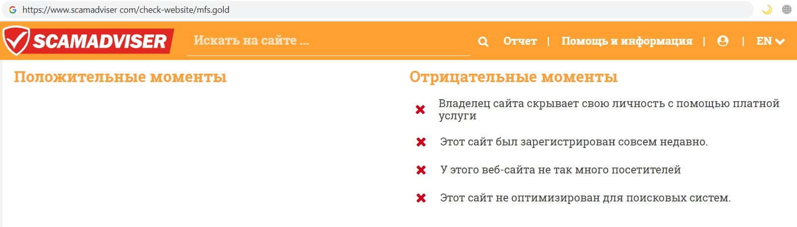 Мы проверили сайт MFS Gold через сайт scamadviser com. Выяснилось, что владелец компании скрывает свою личность, а интернет ресурс фирмы имеет мало посетителей.