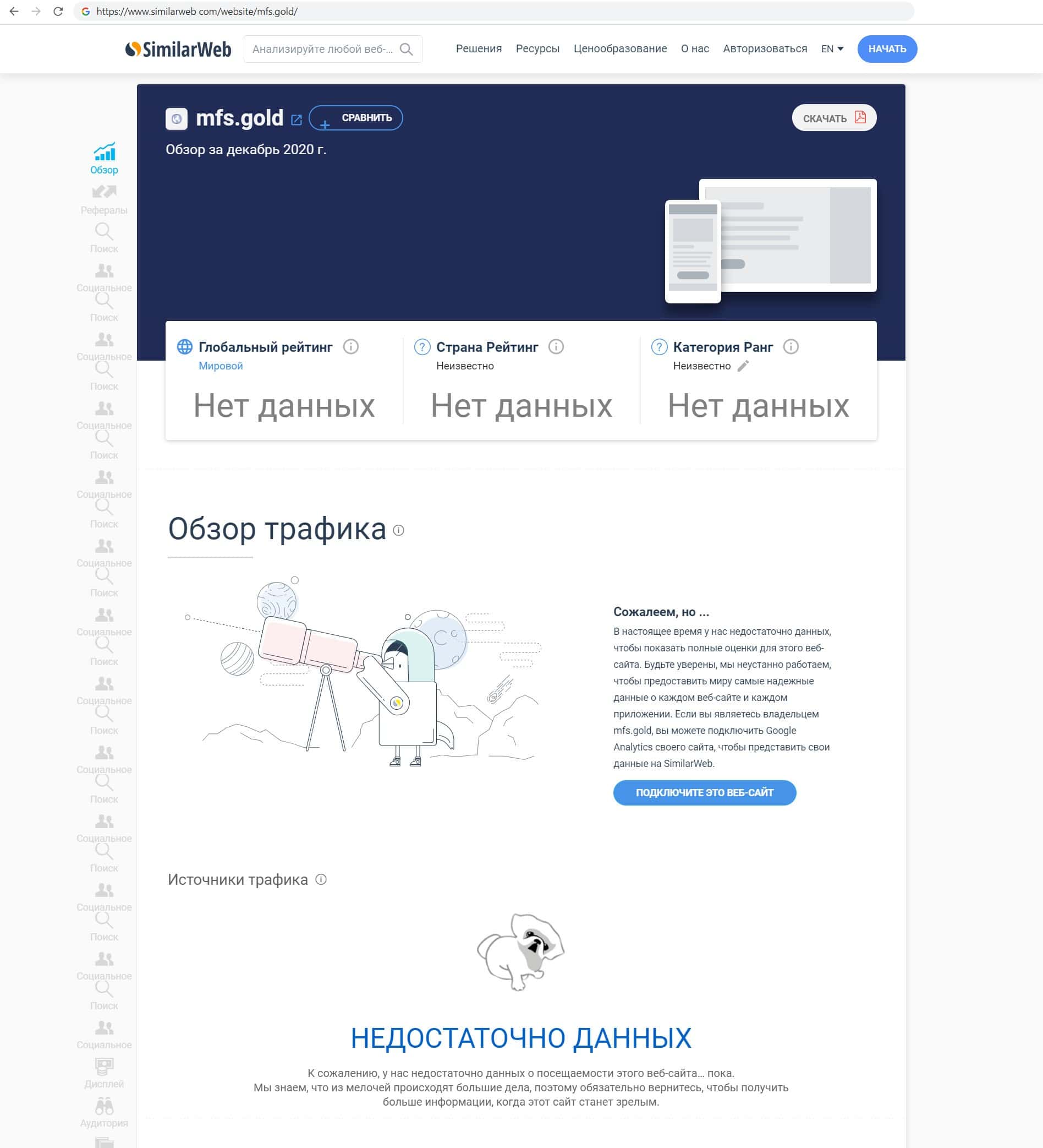 Через сайт similarweb com мы хотели узнать информацию о трафике сайта разводил MFS Gold. Но оказалось, что международный сервис не обладает информацией о этой конторе.