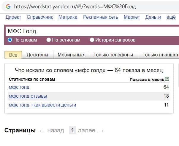 Так же мы проверили количество запросов фирмы аферистов MFS Gold по русскоязычному названию конторы, а именно "МФС Голд". Данный запрос пользователи выполнили 64 раза.