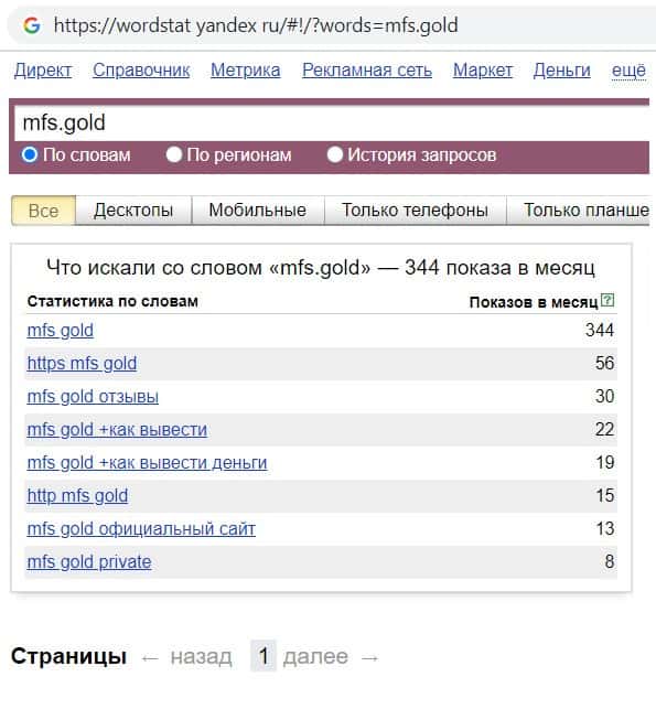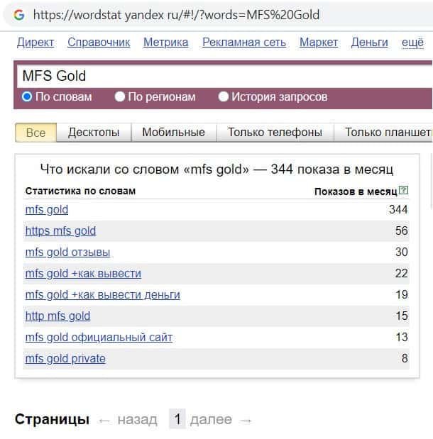 Мы проверили количество запросов компании мошенников MFS Gold в Яндексе по названию фирмы, а именно "MFS Gold". 344 раза пользователи выполняли данный запрос.