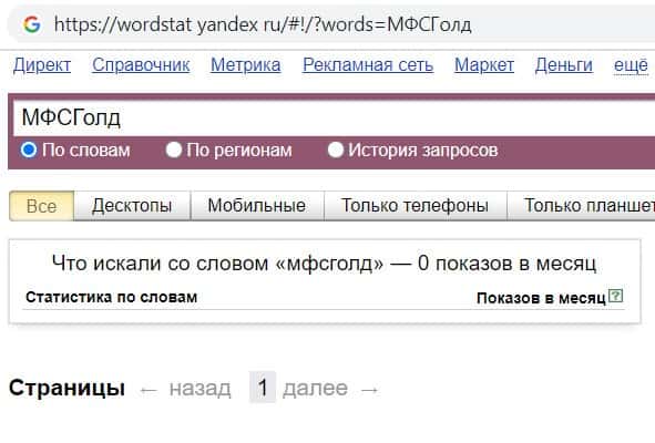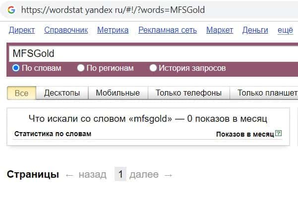 Ещё мы проверили количество запросов фирмы МФС Голд по русскоязычному названию но без пробела, а именно "МФСГолд". Но данный запрос так же никто не выполнял.