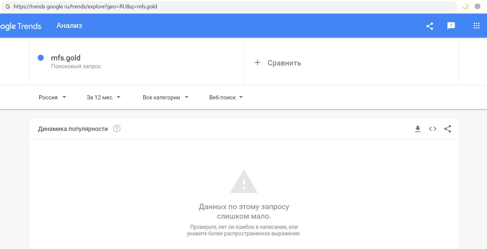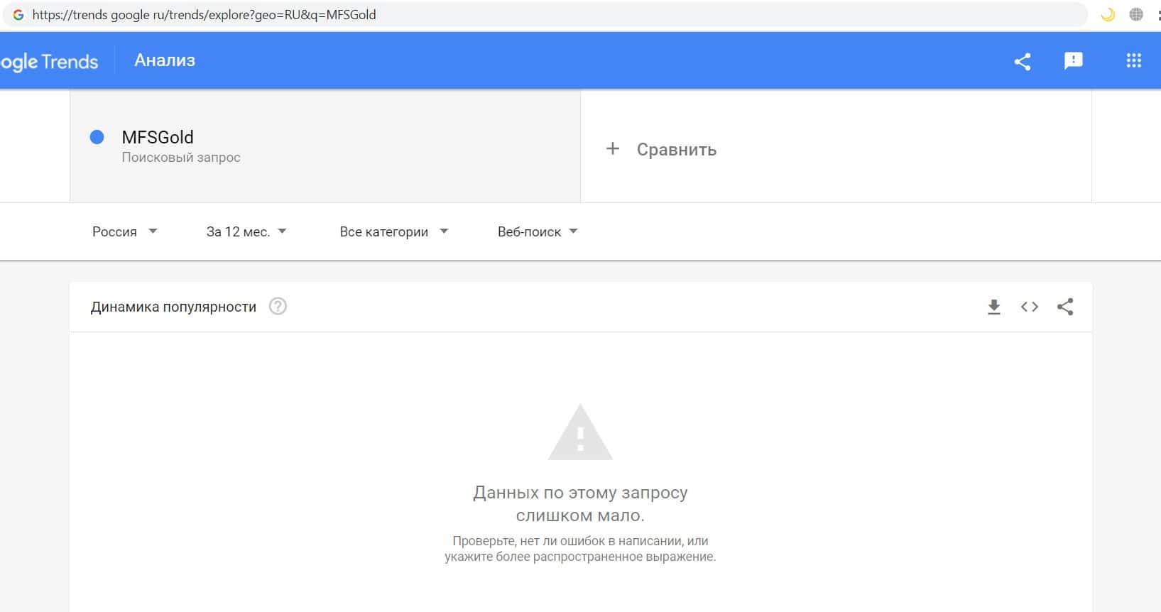 Мы проверили количество запросов фирмы MFS Gold в Google по названию компании, а именно "MFS Gold". Но данный запрос никто из пользователей не выполнял целый год.