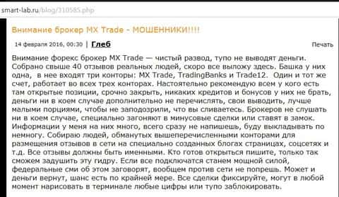 В явно жульнической брокерской конторе МХ Трейд разводили клиентов на немалые суммы, которые достигали десятки, а иногда даже сотни тысяч долларов. Этот псевдоброкер кидал в наглую, отказывая клиенту в выводе депо. При этом мошенники вешали на уже облапошенных трейдеров долговые обязательства. Вот такие опасные аферисты Forex, работают в сети Интернет под видом интернет-лохотрона MXTrade. В доказательство всего описанного, вам предлагается к ознакомлению перечень комментариев по этому поводу, где клиенты МХ Трейд описывали свой плачевный опыт работы с сей кухней.
