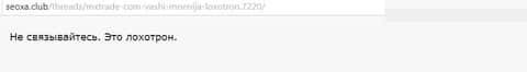Еще один столкнувшийся интернет-пользователь, который столкнулся с аферистами в лице брокерской кухни МХ Трейд, рекомендует держаться подальше от этого явного форекс-лохотрона.