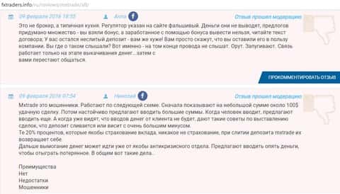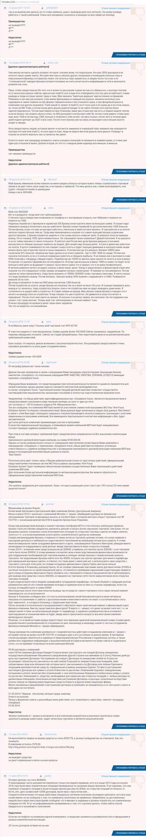 На данный момент конторой МХ Трейд было кинуто немалое количество пользователей всемирной паутины, большая часть из которых лишилась собственных денежных средств именно путем отказа в выводе ихнего депозита со счетов сей финансовой кухни. Также автор следующего комментария об этих жулик, заявляет о связи MXTrade с другими форекс-лохотронами. Более подробно все описано на публикации ниже.