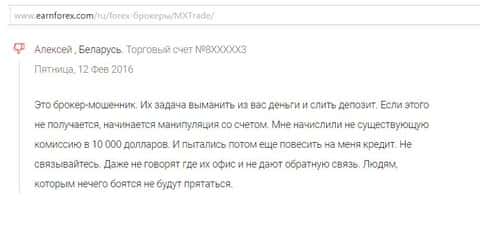 Даже те кто потерял свои деньги в кухне МХ Трейд в результате слива депо из-за разных ловушек в процессе трейдинга на Forex, все-равно столкнулся с нечто не обычным. Например автор следующего коммента об аферистах MXTrade утверждает, что ему обманным образом начислили фальшивую комиссию. Размер которой - 10 000 долларов. Сделали это после того, как жуликам MXTrade не удалось до конца лишить клиента денег с помощью слива средств. Вот тогда то и используют такие подставы как придуманные комиссии и тому подобное. В МХ Трейд будут все делать для того, чтобы потенциальная жертва мошенничества поскорее таковой стала.