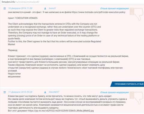 Далее предлагается вашему вниманию не менее примечательный информационный материал о мошеннической форекс-конторе МХ Трейд, нежели тот, что представлен в предыдущих публикациях. Один из ниже опубликованных комментариев описывает наличие в сей кухне Форекс подставного клиентского договора. Ссылаясь на который жулики MXTrade, так сказать в рамках закона обворовывают любителей финансовых игр.
