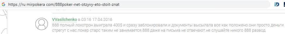 На изображении, расположенном ниже, Вы можете наглядно увидеть очередной негативный комментарий в сторону жулья из Ми 888 Покер от недовольного игрока, которому не единожды заблокировали , а потому и вовсе без объяснений забрали его игровой аккаунт. А таких примеров просто уйма, поэтому нужно не связываться с такими аферистами.