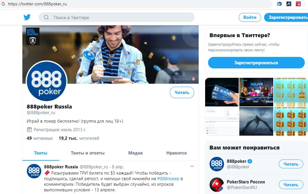Шулерский покер-проект Ми 888 Покер проводит активную деятельность в процессе продвижения своих слуг и соответственно использует для этого социальные сети. Группа в Твиттере составляет примерно 19,2 тысяч читателей. Но ворюги пошли старым проверенным способом - привлечение купленных клиентов. Адрес twitter com/888poker_ru