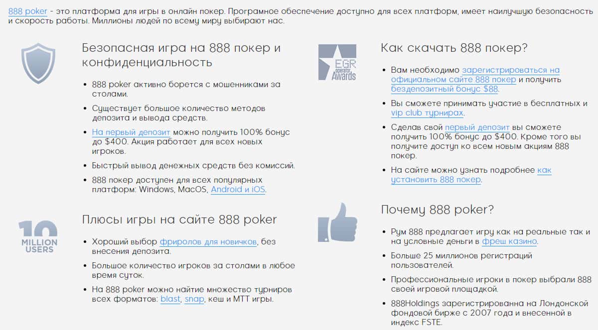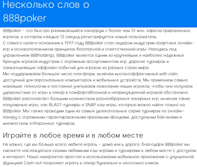 Затем переходим в раздел веб-сайта жульнического проекта My888Poker Ru, в котором говорится о том, что это лучшая платформа для игры в онлайн покер. Программное обеспечение доступно для всех платформ, имеет наилучшую безопасность и скорость работы. Миллионы людей по всему миру выбирают нас. По факту, ложь и лохотрон со всех сторон.