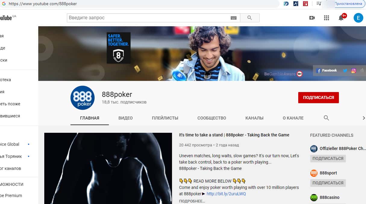 Проходимцы из мошеннической шарашки My888Poker Ru понимают, что одного лишь твиттера для продвижения своих жульнических услуг среди игроков в покер будет слишком маловато, а именно потому они решили привлечь к этой аферной затее еще и ботов. На ютубе у проходимцев насчитывается 18,8 тысяч "подписчиков". Адрес мошенников youtube com/888poker
