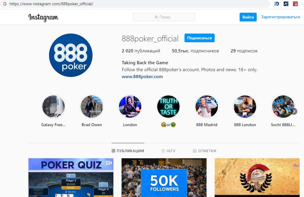 Следующим шагом при распространении своего плутовского проекта махинаторы из Ми 888 Покер выбрали Инстаграм. Количество подписчиков в этой сети в несколько раз превышает предыдущие и составляет 50,5 тысяч подписчиков. Но нет смысла уделять этому внимание, так как реальных людей - единицы, остальное купленные. Адрес instagram com/888poker_official/