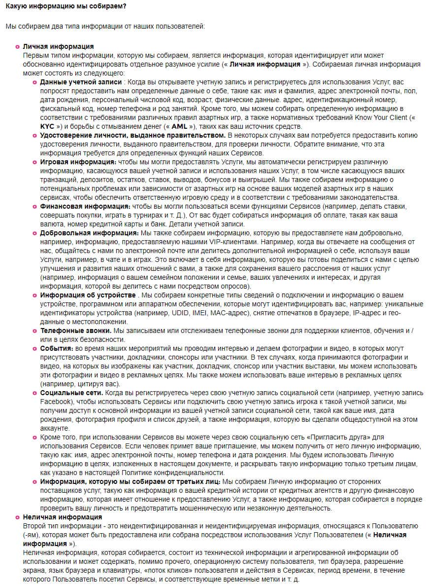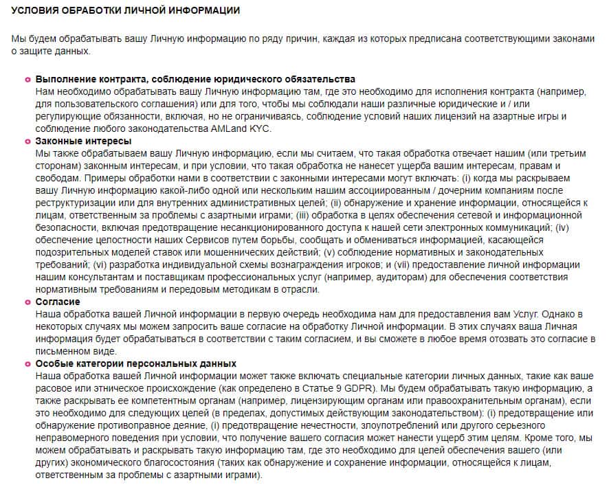 Следующий раздел политики конфиденциальности "Условия обработки личной информации" свидетельствует о еще одном явном нарушении законных прав и интересов клиентов. Мошенники Ми 888 Покер прикрывают свои злодеяния предписаниями законами о защите данных Но где же эти нормы, когда люди остаются без гроша в кармане из-за их афер.