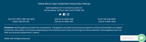 Завершается сайт лохотрона Ми Чардж Бэк ссылками на страницы шулеров в социальных сетях, контактами и предупреждением о рисках, в котором аферисты MyChargeBack предупреждают о том, что у них бесплатна только консультация, и судя по этому они берут с клиентов предоплату.