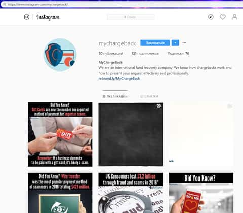 Ну и дабы соответствовать всем современным трендам проходимцы MyChargeBack создали страницу в социальной сети Instagram. Думаем и так очевидно, что и на этой странице шулеров Ми Чардж Бэк в социальной сети Инстаграм никакой активности абсолютно не наблюдается.
