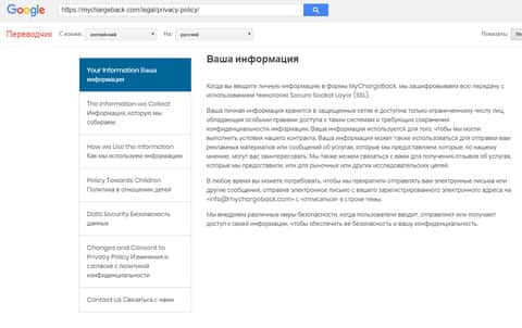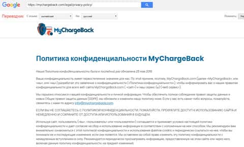Далее в политике конфиденциальности жуликов Ми Чардж Бэк следует информация о том, что мошенники MyChargeBack хранят и защищают вашу информацию. Впрочем это стандартный для аферистов Ми Чардж Бэк шаг в плане обещаний. На обещаниях построен весь сайт мошенников.