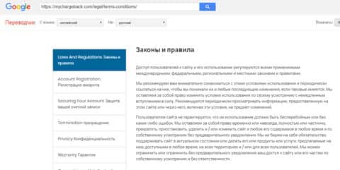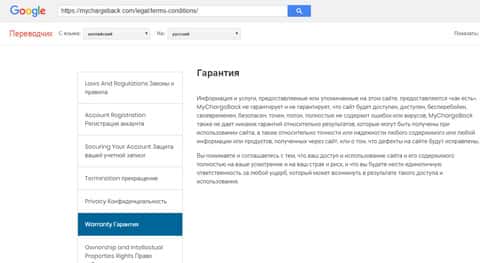 Так как данные условия сотрудничества никакой особой смысловой нагрузки в себе не несут, то и в разделе гарантий аферистов MyChargeBack нету никакой конкретики, а только лишь условие того, что жулики Ми Чардж Бэк предоставляют информацию "как есть", подписывая на это клиента.