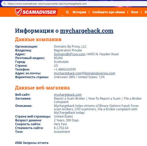 В связи со своей мошеннической деятельностью, направленной на развод пользователей на аванс якобы для возврата шулера MyChargeBack предпочитают анонимность как для себя так и для сервера своего сайта, дабы не понести уголовную ответственность за многочисленные кидания трейдеров.