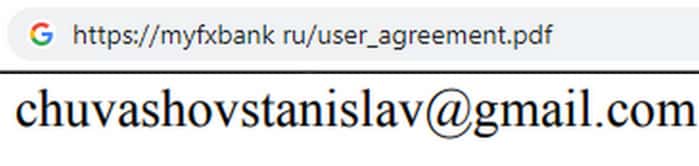 Мошенники MyFxBank на своем официальном интернет-ресурсе указывают адрес электронной почты, а именно: